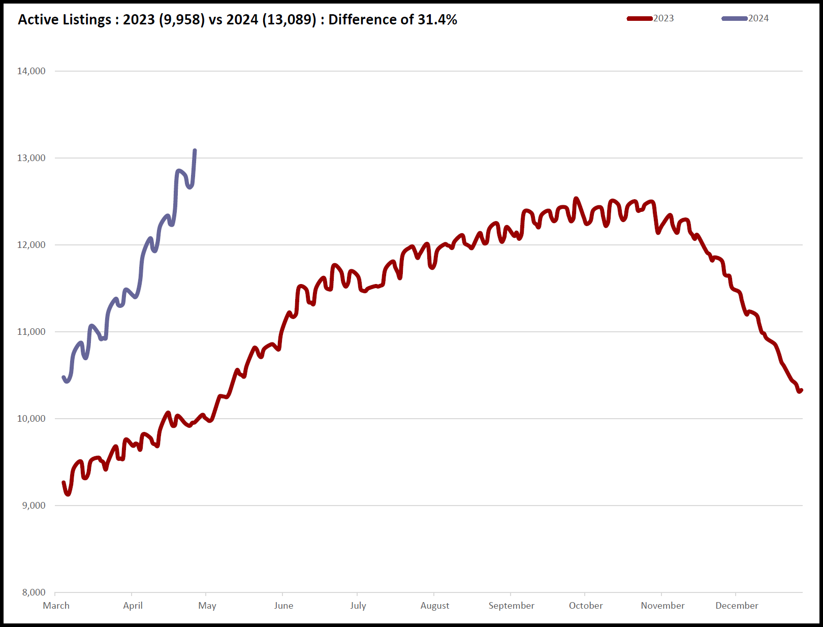 This trend suggests a cooling market, where the growing supply is beginning to meet the existing demand, potentially leading to more negotiable prices and a longer duration of listings on the market. Such conditions typically provide buyers with more options and less urgency to make quick decisions, while sellers may need to adjust their expectations and strategies.